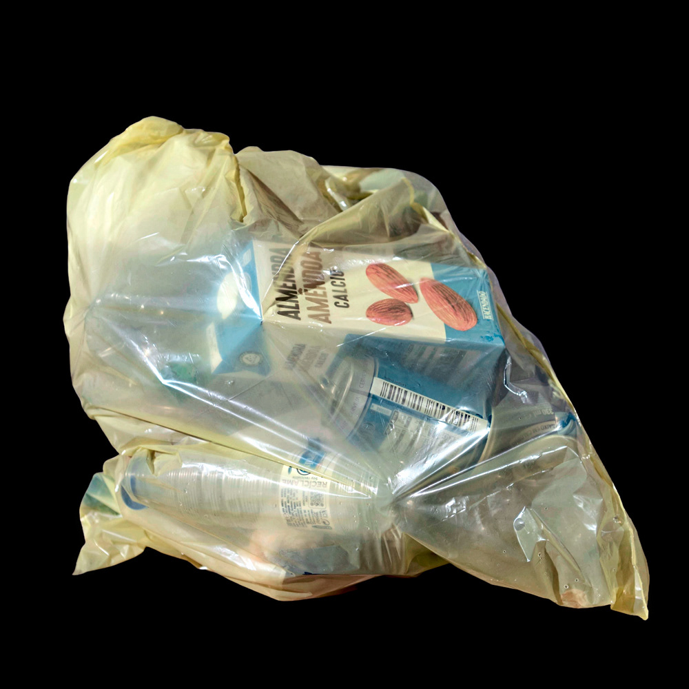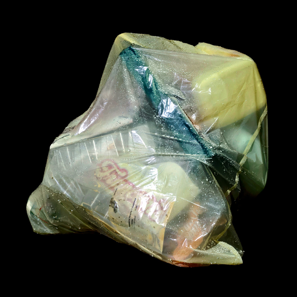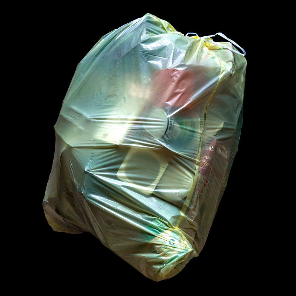 YELLOW emerges from night walks where yellow garbage bags, under artificial light, reveal traces of a consumption that still defines our society. Observed as strange compositions—fragments of what was once useful—plastic becomes a pictorial surface. Transparent and ordinary, waste is transformed into image, suspended between attraction and discomfort.