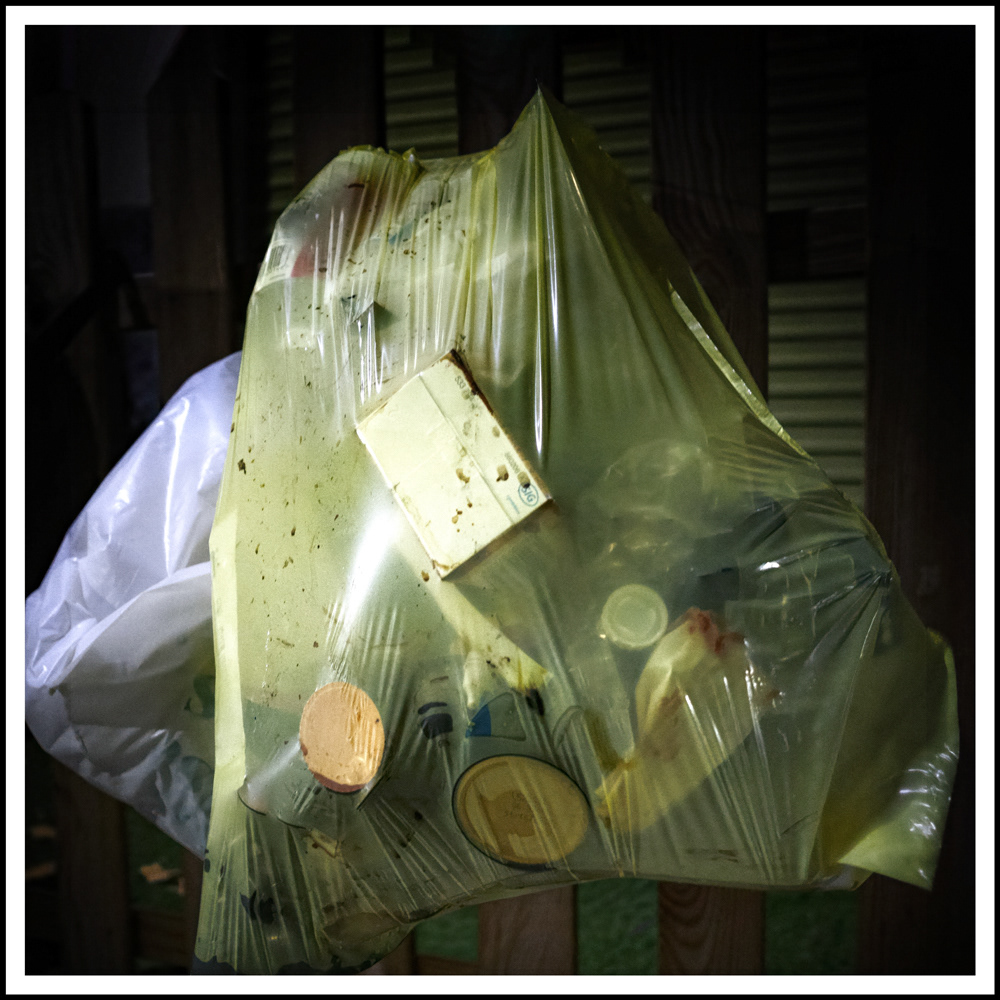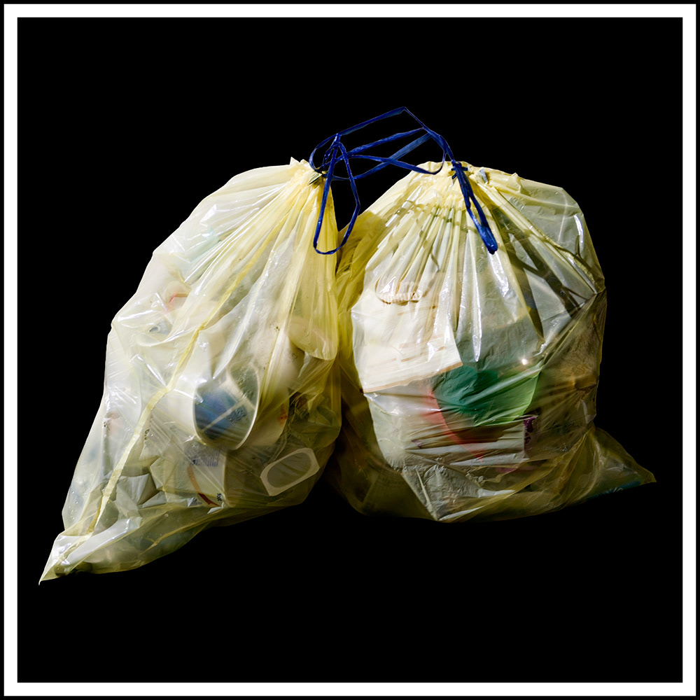 During my night walks with Tula, I notice the yellow garbage bags that, under artificial light, reveal traces of a consumption that still defines our society. I stop in front of them as if they were strange compositions — fragments of what was once useful and now waits to disappear. Yellow comes from that gaze: a fascination with what we throw away, with the matter that carries our mark. Transparent and ordinary, plastic turns into a pictorial surface — a veil that transforms waste into image.